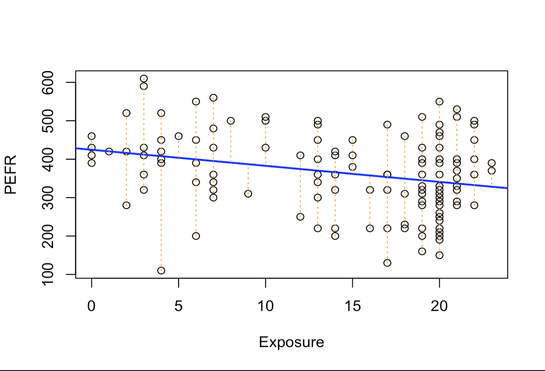 segments(lung1$Exposure, lung1$PEFR, lung1$Exposure, lung1$Fitted, col="orange", lty=3)