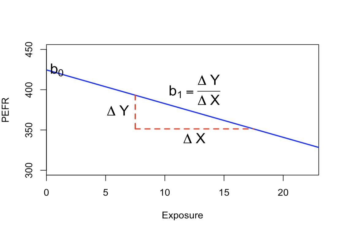 model <- lm(PEFR ~ Exposure, data=lung)