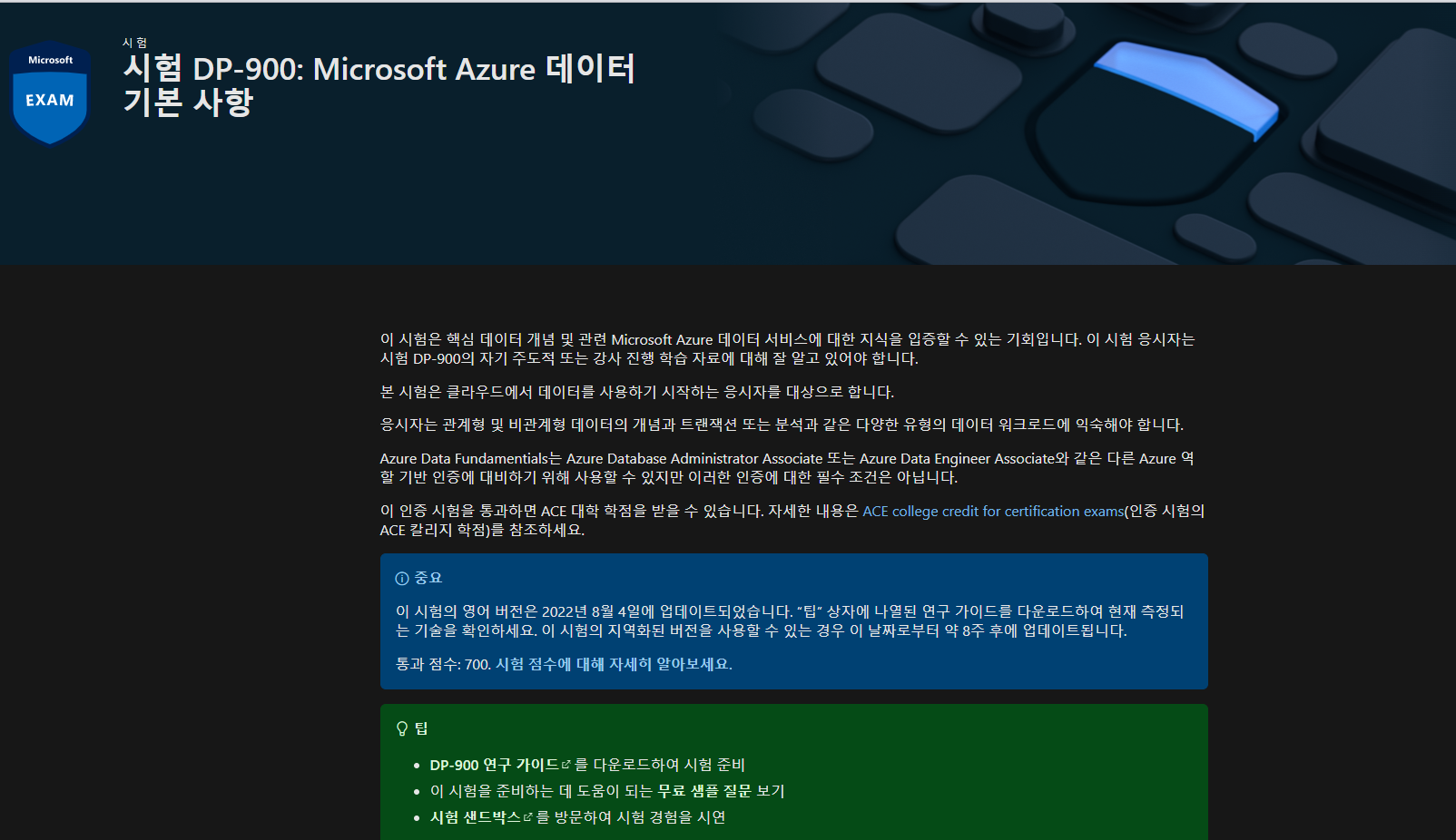MS 사의 기본 자격증 중 하나인 DP-900은 데이터 개념 및 관련 MS Azure 데이터 서비스에 관해 가장 기초적인 시험이다.