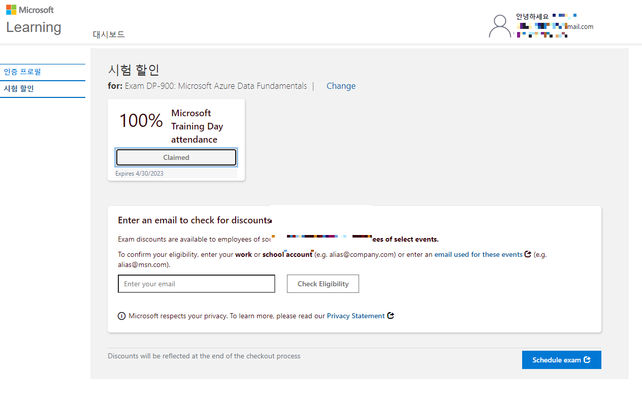 1) 교육을 들은 후 시험신청 가능 메일 링크를 눌러 프로필을 생성하고, 시험 할인을 적용하는 과정