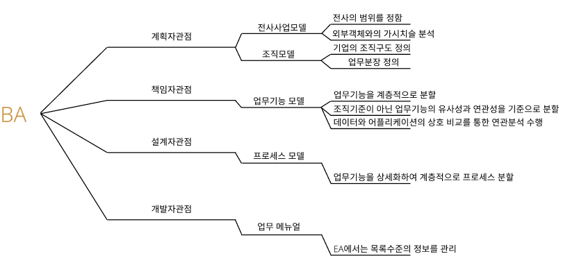 - 정보 : 현행 아키텍처, 목표 아키텍처는 도메인별 아키텍처 정보를 구축. 여기에서의 정보란 (BA 비즈니스, DA 데이터, AA 애플리케이션, TA기술) 구분. 이를 아키텍처 도메인이라 정의